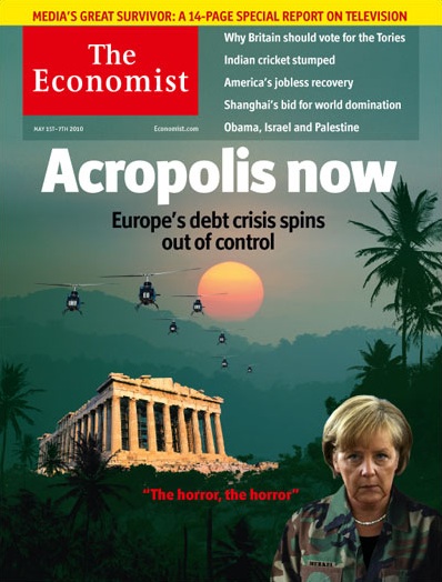 Το οικονομικό περιοδικό Economist παρακολουθεί στενά την κρίση στην Ευρωζώνη τα τελευταία δύο χρόνια και την έχει αποτυπώσει με το δικό του μοναδικό τρόπο στα εξώφυλλα του, στα οποία δυστυχώς πολύ συχνά πρωταγωνιστεί η Ελλάδα και φυσικά η Μέρκελ.