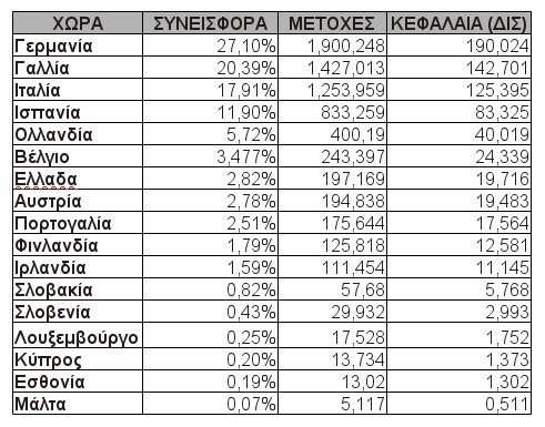 Κάθε χώρα θα συμμετάσχει στα κεφάλαια του ESM με ένα ποσό ανάλογο του ΑΕΠ της. Τα μεγαλύτερα βάρη θα σηκώσουν η Γερμανία, η Γαλλία και η Ιταλία, οι οποίες θα δώσουν το 64% των κεφαλαίων του νεοσύστατου Μηχανισμού. Και η Ελλάδα όμως θα κληθεί να συνεισφέρει με σχεδόν 20 δισεκατομμύρια ευρώ. Από αυτά, σε μετρητά θα δοθούν τα 2,254 δισ. ενώ τα υπόλοιπα σε εγγυήσεις.