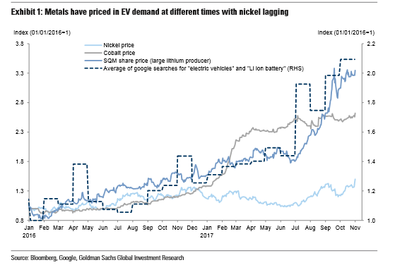 Το κοβάλτιο παρουσίασε έντονο ράλι το 2017, ενώ τα εκτιθέμενα σε λίθιο περιουσιακά στοιχεία (με την τιμή μετοχής ενός μεγάλου παραγωγού λιθίου SQM) παρουσίασαν ικανοποιητική πορεία το τρίτο τρίμηνο του 2017 παράλληλα με το αυξημένο δημόσιο ενδιαφέρον για ηλεκτρικές στήλες και μπαταρίες ιόντων λιθίου .